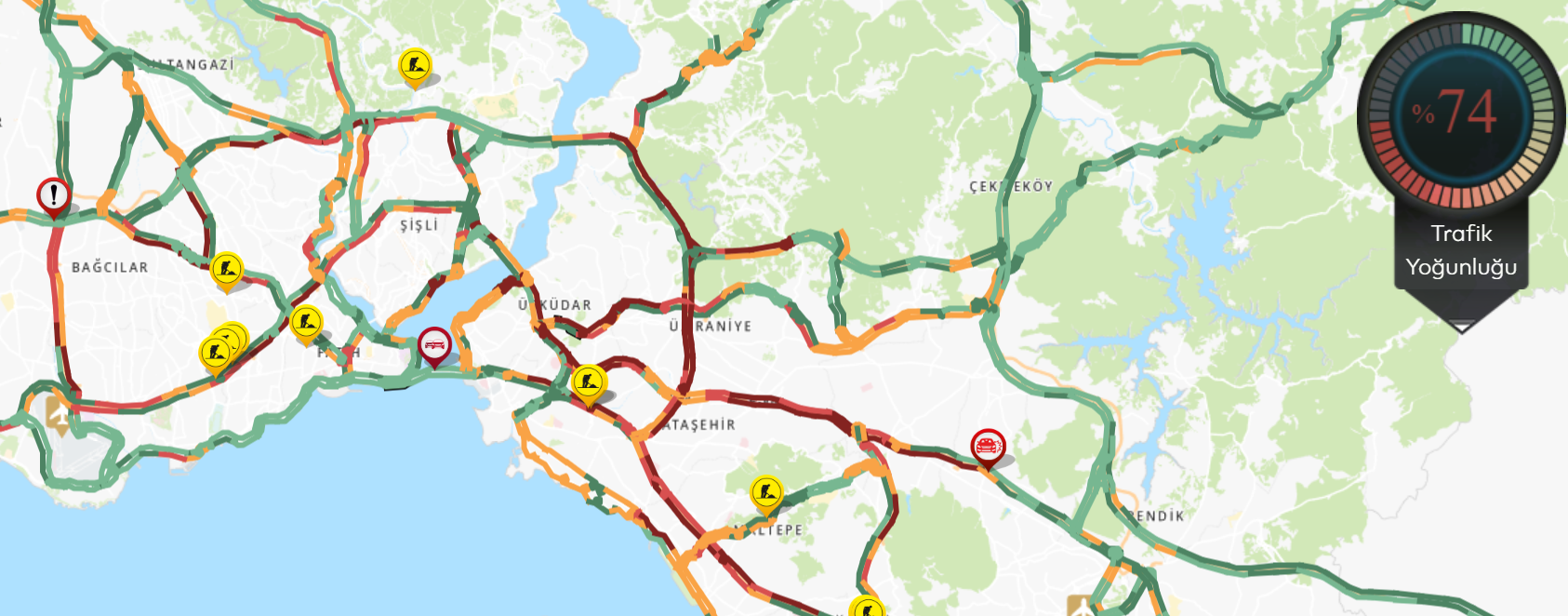 İstanbul Büyükşehir Belediyesi haritasına göre trafik yoğunluğu yüzde 74’te seyrediyor.
