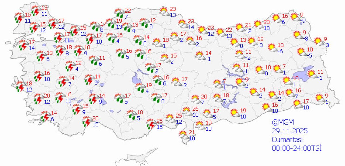 Cuma günü İstanbul, Kırklareli, Edirne, Tekirdağ, Çanakkale, Yalova, Bursa, Balıkesir, Manisa, İzmir, Kütahya, Afyonkarahisar, Uşak, Isparta, Antalya, Burdur, Denizli, Muğla ve Aydın illerinde gök gürültülü sağanak yağışlar bekleniyor.